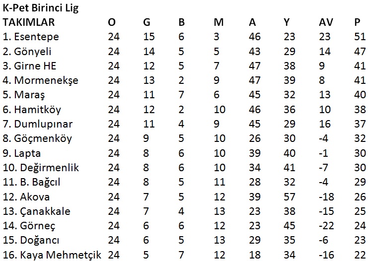 K-Pet Birinci Lig’in 24’üncü haftası geride kalırken lig lideri Esentepe haftayı puansız kapattı. Kağıt üzerinde favori ekiplerin beklenmedik puan kayıpları yaşadığı haftada Esentepe konuk olduğu Maraş’a 4-1’lik farklı skorla yenildi. Lig ikincisi Gönyeli ise konuk olduğu Akova’yı 3-2 mağlup ederek lider ile arasındaki puan farkını 4’e indirdi. Dumlupınar’ın Mormenekşe’yi 4-0 yendiği haftada Girne Halk Evi alt sıralardan kurtulma mücadelesi veren Kaya Mehmetçik ile 3-3 berabere kalarak haftayı puan kaybı ile kapattı. Hamitköy ise bir diğer alt sıralardan kurtulma mücadelesi veren Doğancı’ya kendi sahasında 5-4’lük skorla boyun eğdi.