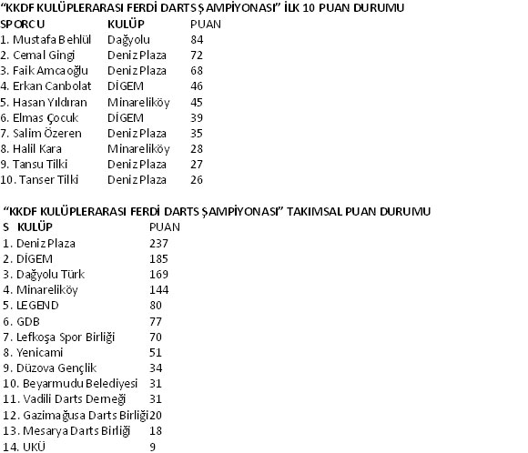 Turnuva sonunda düzenlenen ödül töreninde dereceye giren sporculara madalyalarını KKDF Başkanı Gürtap Davutoğlu ve KKDF Yönetim Kurulu Üyesi Avşın Kanatlı tarafından verildi. “KKDF Kulüplerarası Ferdi Darts Şampiyonası” 6’ncı ayak sonuçları ve puan durumları şöyle: