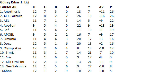 Güney Kıbrıs 1. Ligi’nde 12’nci hafta tamamlandı. Haftaya lider giren Anorthosis konuk olduğu Ermis’i 2-1’lik skorla yenerek haftayı lider noktaladı. AEK Larnaka deplasmanda Ahna’yı 3-0 yenerek zirve takibini devam ettirirken, AEL kendi sahasında Nea Salamina’yı 3-1’lik skorla geçerek haftayı üçüncü sırada tamamladı.