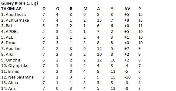 Güney Kıbrıs 1. Ligi’nde yeninci hafta karşılaşmaları tamamlandı. Oynanan karşılaşmaların ardından Anorthosis liderliğini devam ettirdi. Önceki haftayı beraberlikle kapattıktan sonra bu hafta da Apollon ile 1-1 berabere kalmasına karşılık Anorthosis ilk basamaktaki yerini korudu. AEK Larnaka ise deplasmanda Aris’i 5-0’lık skorla yenerek haftanın en farklı galibiyetine imza attı ve lider ile puan farkını ikiye indirdi. Baf’ın çıkışı bu hafta da sürdü. Lige mağlubiyetle başladıktan sonra oynadığı 5 maçtan 3 galibiyet ve 2 beraberlik çıkaran Baf, bu hafta deplasmanda AEL’i tek golle yenerek maç eksiği ile üçüncü sırada yer aldı. Kıbrıs’ın güneyini Şampiyonlar Ligi’nde temsil eden APOEL ise haftanın açılış maçında Doxa’yı 2-0 yendi. İki maç eskiği bulunan APOEL’in 10 puanı bulunuyor. İstikrarsız görüntüsü ile dikkat çeken Omonia deplasmanda Ermis’e 2-1 yenildi. Son üç maçta 2 puan alabilen Omonia bir maç eksiği ile dokuzuncu sırada bulunuyor. Alki’nin deplasmanda Olympiakos’u 3-0 yendiği haftada Nea Salamina ile Ahna golsüz berabere kaldı.