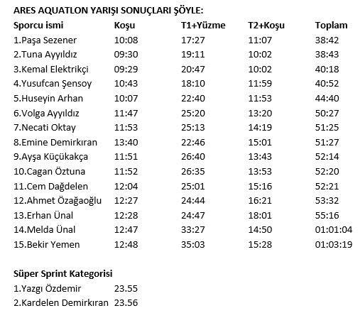 Süper sprint kategorisi 2 sporcu olmak üzere toplam 17 sporcunun katılımı ile gerçekleşen aquatlon yarışında en hızlı dereceyi elde eden Paşa Sezener, arkadaşı Tuna Ayyıldız’ı 1 saniye farkla geçti.