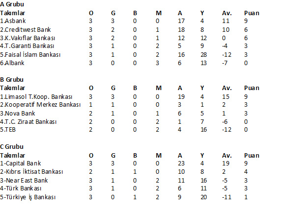 İkinci hafta maçları sonunda A Grubu'nda Asbank, B Grubu'nda Limasol Türk Kooperatif Bankası, C Grubu'nda ise Capital Bank 9'ar puanla zirvede yer aldı. Turnuvada son hafta mücadeleleri yarın akşam başlayacak ve yeni haftanın sonunda çeyrek finale yükselen takımlar belirlenecek.