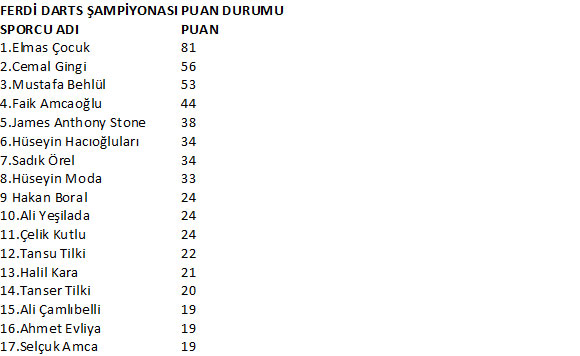 On ayaktan oluşan Ferdi Darts Şampiyonası’nın beşinci ayağında Elmas Çocuk finalde James Anthony Stone’u mağlup etti. Elmas Çocuk, elde ettiği şampiyonlukla genel klasmanda 81 puanla zirvedeki yerini sağlamlaştırdı.