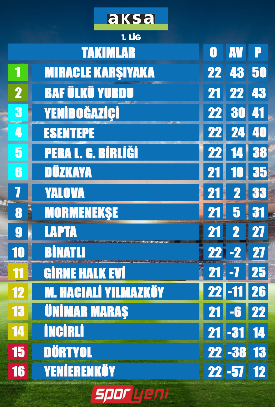 AKSA Birinci Lig’de 22. hafta bugün oynanan müsabakalarla başladı. Türkiye’de gerçekleşen deprem felaketi ve kayıplarımız nedeniyle futbola verilen zorunlu ara sonrasında sezon planlamasına uygun şekilde sezonu tamamlamak için Kıbrıs Türk Futbol Federasyonu (KTFF), liglerin bazı hafta maçlarını hafta arasına koymuştu. Birinci Lig’de bugün başlayan 22. hafta maçlarında Esentepe, Binatlı, Yenierenköy ve Miracle Karşıyaka günü galibiyetle kapatan ekipler oldular.