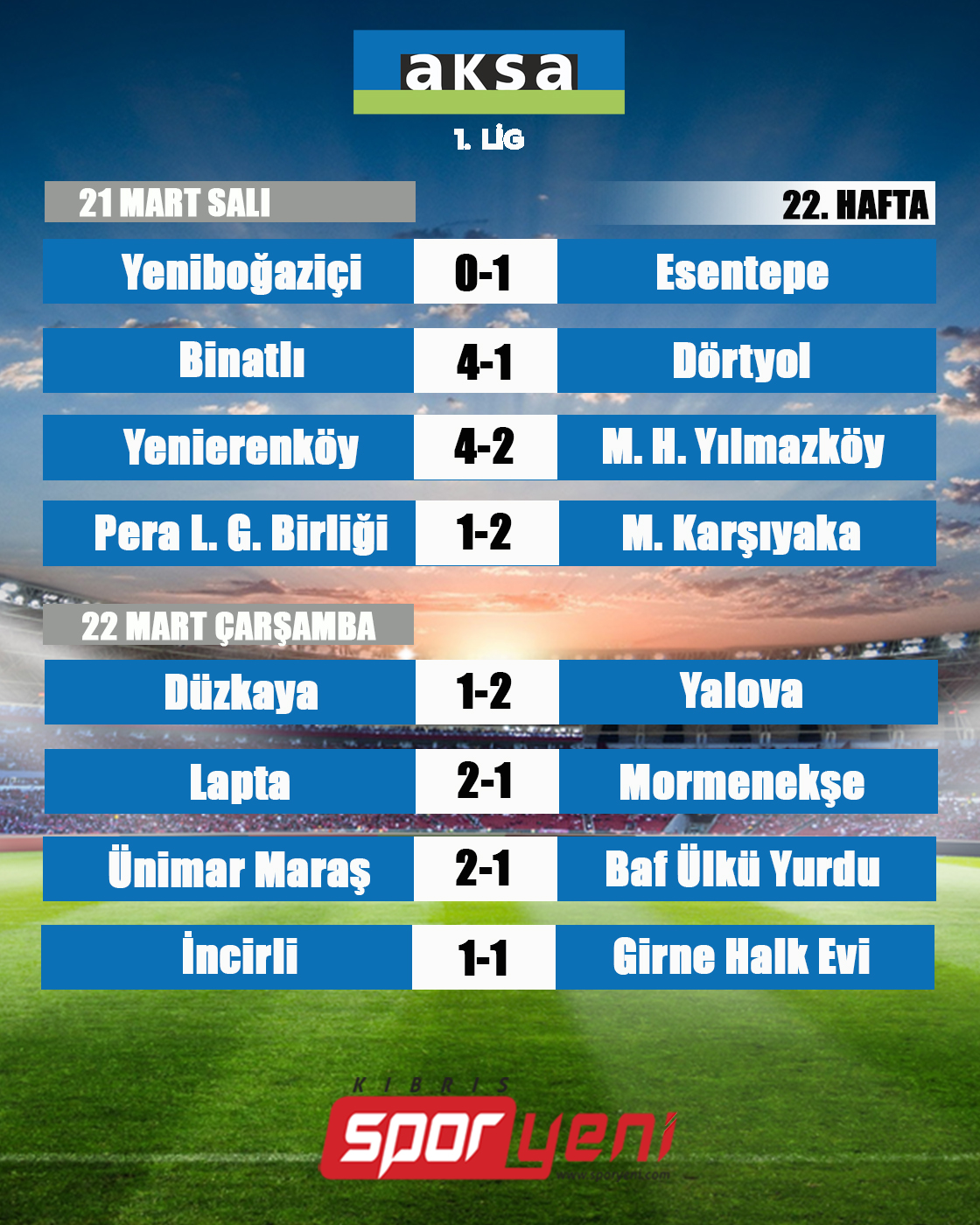AKSA Birinci Lig’de 22. hafta dün oynanan karşılaşmalarla tamamlandı. Türkiye’de gerçekleşen deprem felaketi ve kayıplarımız nedeniyle futbola verilen zorunlu ara sonrasında sezon planlamasına uygun şekilde sezonu tamamlamak için Kıbrıs Türk Futbol Federasyonu (KTFF), liglerin bazı hafta maçlarını hafta arasına koymuştu. Bu çerçevede Birinci Lig’in 22. haftası Salı ve Çarşamba günleri oynandı. Bugün oynanan karşılaşmalar sonunda Yalova, Lapta ve Ünimar Maraş galip gelirken İncirli ile Girne Halk Evi berabere kaldı.