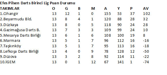 Efes Pilsen Darts Birinci Ligi 13’üncü hafta maçlarında alınan sonuçlar ve oluşan puan durumu şöyle: