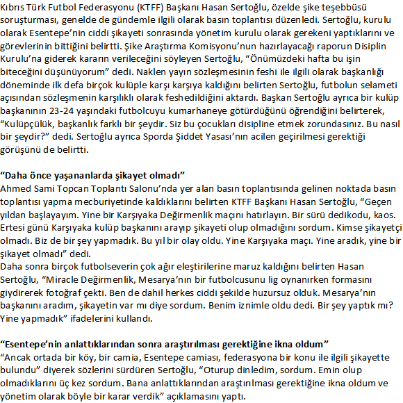 Kıbrıs Türk Futbol Federasyonu (KTFF) Başkanı Hasan Sertoğlu, özelde şike teşebbüsü soruşturması, genelde de gündemle ilgili olarak basın toplantısı düzenledi.