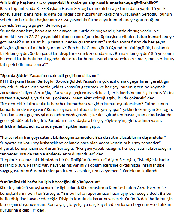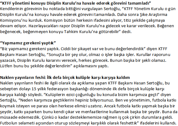 RAPOR HAZIRLANACAK, DİSİPLİNE VERİLECEK… Sertoğlu: “Biz yapmamız gerekeni yaptık. Ciddi bir şikayet vardı ve bunu değerlendirdik. Şike Araştırma Komisyonu titiz şekilde çalışmaya devam ediyor. Hazırlayacakları rapor Disiplin Kurulu’na gidecek. Önümüzdeki hafta bu işin biteceğini düşünüyorum.”