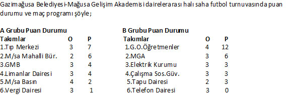 Gazimağusa Belediyesi-Mağusa Gelişim Akademisi tarafından düzenlenen Daireler arası Halı Saha Futbol turnuvasına dün akşam A ve B grubunda oynanan maçlarla devam edilirken çeyrek finalistler belirleniyor. Gazimağusa Belediyesi-Mağusa Gelişim Akademisi dairelerarası Halı Saha Futbol Turnuvası Gazimağusa Belediyesi Doktor Fazıl Küçük Spor Kompleksi içerisindeki halı sahalarda 12 takım katılımı ile iki grupta altışarlı takımlar mücadele ediyor. Gazimağusa Belediyesi-Mağusa Gelişim Akademisi Dairelerarası Halı Saha Futbol Turnuvası’nda A grubu’nda Gazimağusa Belediyesi, Verdi Dairesi’ni 7-2, Tıp Merkezi, Mağusa Basın’ı 6-5 mağlup etti. B grubunda ise Elektrik Kurumu, Telefon Dairesi’ni 8-0, Genel Orta Öğretmenler, Çalışma Sosyal Güvenlik’i 16-6 mağlup etti. Turnuva tek devreli ligi usulüne göre oynanan grup maçları 5 Aralık Salı akşamı tamamlanacak. Turnuvaya bu akşam A ve B grubunda oynanacak karşılaşmalar ile devam edilecek.