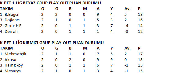 K-Pet Birinci Lig Kırmızı Grup play out grubuna bakıldığı zaman ise çekişmenin hat safhada olduğu dikkat çekiyor. Grupta lider bulunan Mehmetçik son haftaya biraz rahat girse de, küme düşme şansı devam ediyor. Kırmızı Grup’ta Mehmetçik dışında diğer 3 takımın da 15 puanı bulunuyor. Grupta bugün Hamitköy – Mehmetçik ve Akova – Mesarya maçları oynanacak. İki grupta da toplam oynanacak 4 karşılaşmaların tümü de 16.00’da başlayacak. Play out maçlarının sonunda hem Kırmızı Grup, hem de Beyaz Grup’tan birer takım düşecek.