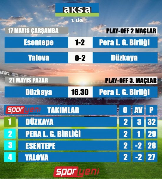 Düzkaya ile Esentepe, 21 Mayıs Pazar günü Play-off 3. maçında karşı karşıya gelecek. Düzkaya bu maçta mağlup olmaması durumunda Süper Lig’e yükselecek. Gençler Birliği ise galip gelmesi halinde Düzkaya’nın normal sezon puanının yarısı yuvarlandığı için Süper Lig’e yükselecek son takım olacak.