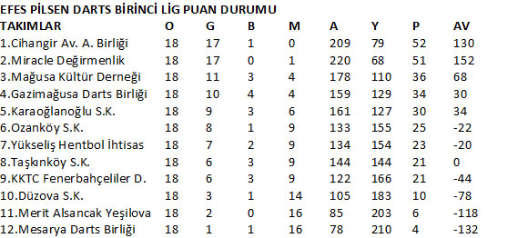 Efes Pilsen Darts Birinci Ligi’nin 18nci hafta maçlarında alınan sonuçlar ve oluşan puan durumu şöyle: