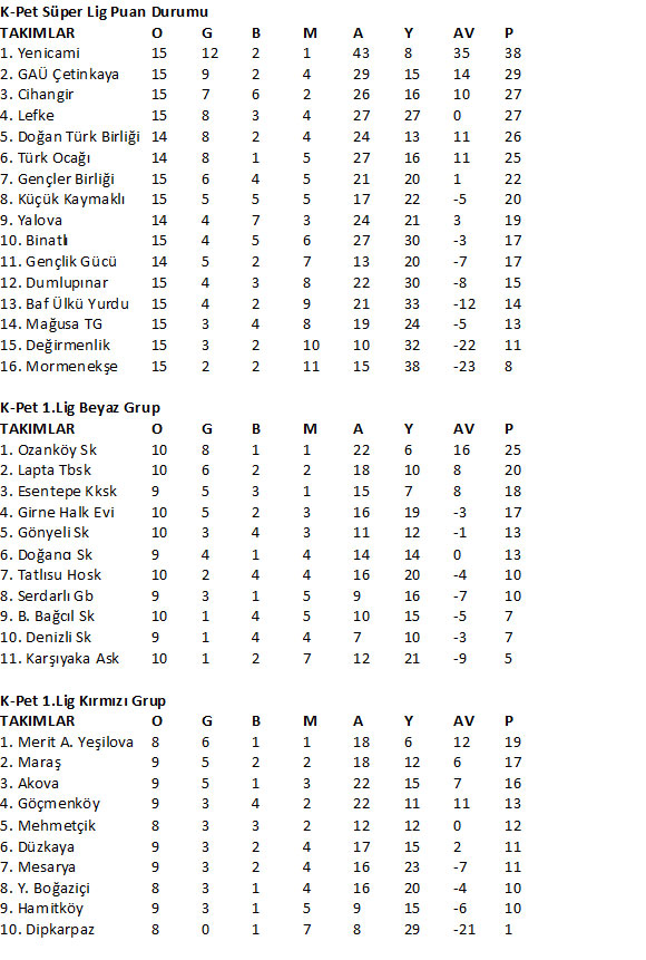 K-Pet Süper Lig’de bugün Doğan Türk Birliği, Gençlik Gücü’nü konuk edecek. Girne Mete Adanır Stadı’nda oynanacak olan karşılaşmanın yanı sıra Fikri Karayel Stadı’nda Yalova ile Türk Ocağı puan mücadelesi verecek. K-Pet Birinci Lig Kırmızı Grup lideri Merit Alsancak Yeşilova erteleme maçında Mehmetçik’in konuğu olacak. Grubun diğer maçında Dipkarpaz ile Y.Boğaziçi karşılaşacak. K-Pet Birinci Lig Beyaz Grup’ta ise Serdarlı – Esentepe ve Doğancı Denizli karşılaşmaları oynanacak. Karşılaşmalar saat 14.30’da başlayacak.