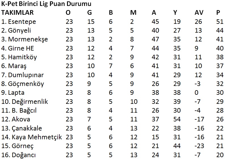 K-Pet Birinci Lig’de 23’üncü hafta geride kalırken lider Esentepe en yakın rakibi Gönyeli ile arasındaki puan farkını 7’ye yükseltti. Esentepe konuk ettiği Dumlupınar’ı 2-1 yenerken takipçisi Gönyeli konuk olduğu Çanakkale deplasmanında tek golle mağlup oldu. Bu skorla lider ile ikinci arasındaki puan farkı 7’ye yükseldi. Mormenekşe’nin konuk ettiği Görneç’i 2-1, Girne Halk Evi de deplasmanda Bostancı Bağcıl’ı 4-2 yenerek haftayı 3 ve 4’üncü sıralarda tamamladı. Kaya Mehmetçik deplasmanında tek golle mağlup olan Hamitköy 5’inci sırada yer alırken Doğancı ile Maraş golsüz berabere kalarak haftayı puan kayıpları ile kapattı. Lapta konuk ettiği Göçmenköy’ü 4-1 ile geçerken Değirmenlik ile Akova 2-2’lik skorla 1’er puanı hanelerine yazdırdılar.