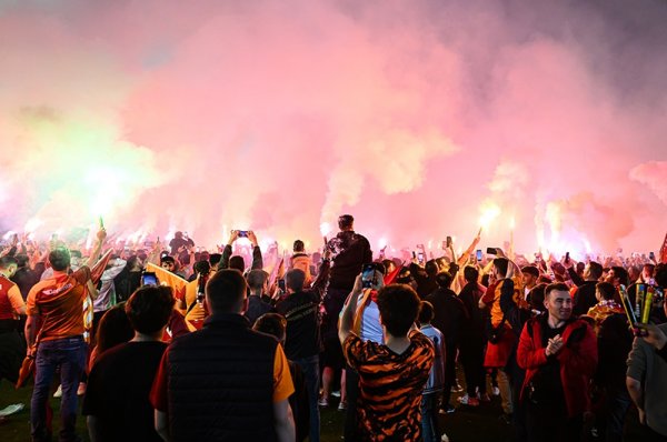 A takımın antrenman yaptığı sahaya alınan taraftarlar, kutlamalarına burada devam etti.