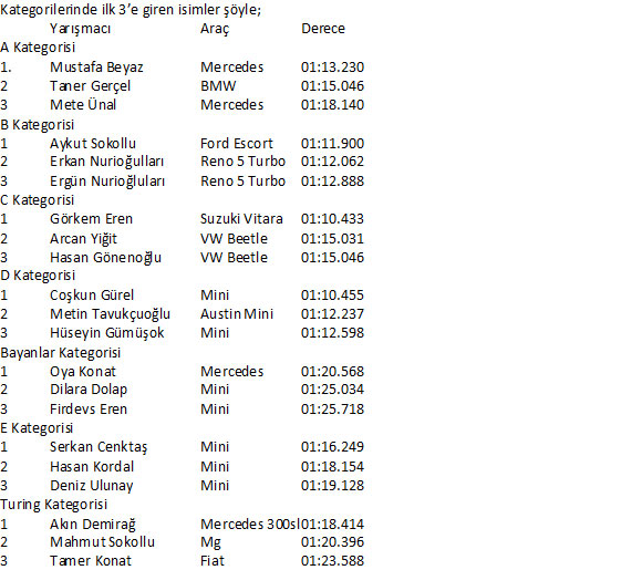Girne Belediyesi ana sponsorluğunda ve KKTC Telsim iletişim sponsorluğunda gerçekleştirilen Girne Belediyesi Slalom Yarışına toplamda 70 yarışmacı kayıt yaptırdı. 4 aracın mekanik sebeplerden dolayı start alamadığı yarışta 7 kategoride birinciler belirlendi. Baldöken Oto Parkı içerisinde hazırlanan kısa parkurda ikişer tur üzerinden yapılan yarışı kalabalık seyirci topluluğu takip etti. Yarışın ardından ödül töreni yine aynı yerde yapılırken, dereceye giren yarışmacılara kupaları takdim edildi. A kategorisinde Mustafa Beyaz, B Kategorisinde Aykut Sokollu, C Kategorisinde Görkem Eren, D Kategorisinde Coşkun Gürel, E kategorisinde Serkan Cenktaş, Bayanlar Kategorisinde Oya Konat ve Turing Kategorisinde Akın Demirağ birincilik kupalarını almaya hak kazanan isimler oldular.
