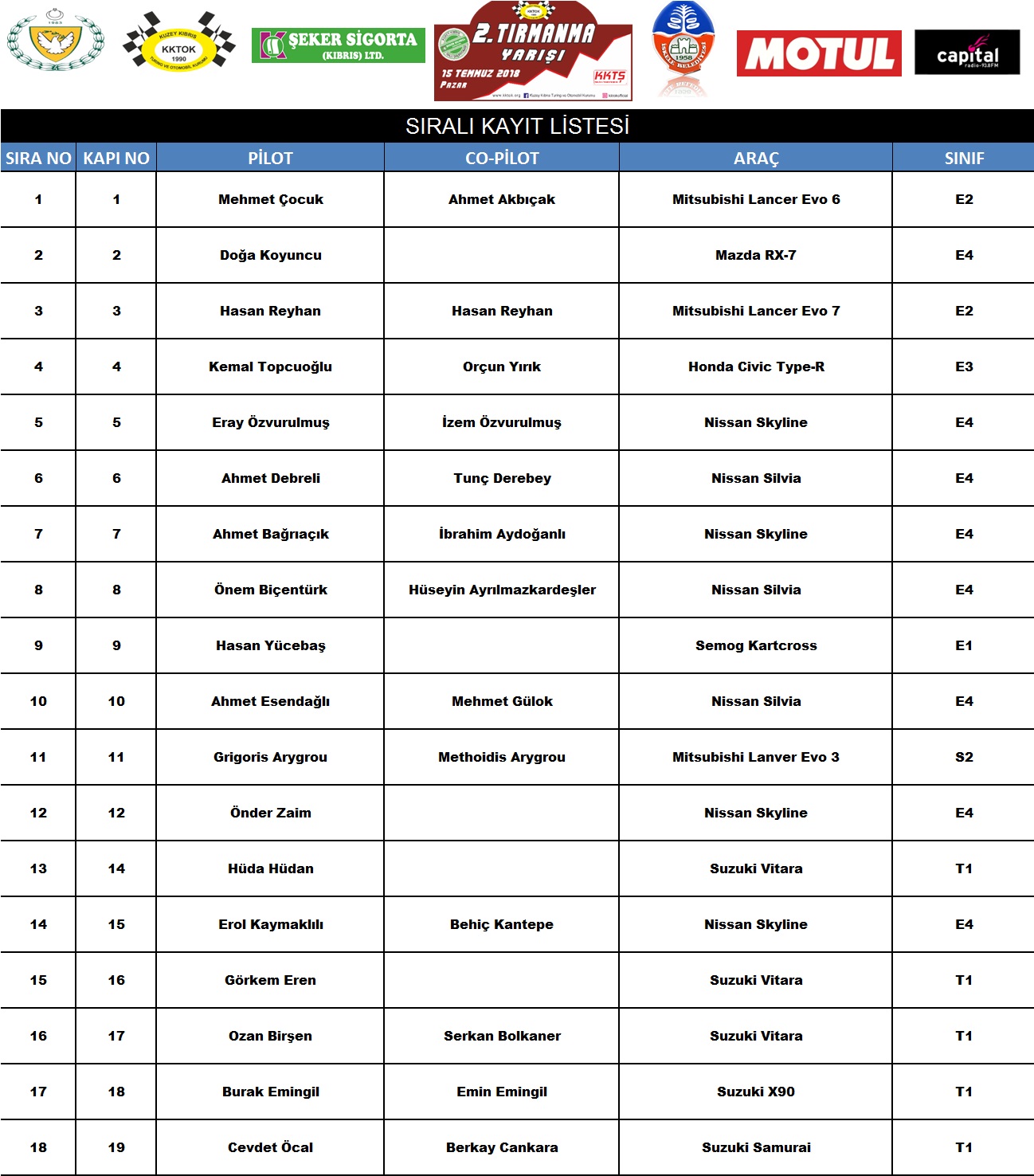 Kuzey Kıbrıs Turing ve Otomobil Kurumu’nun organize ettiği 2018 Şeker Sigorta Tırmanma Şampiyonası’nın Ardahan’da yapılacak olan ikinci yarışının kayıtları kapandı.
