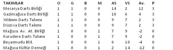 Mesarya ve Gazimağusa Darts Birlikleri tarafından organize edilen ve Gazimağusa Belediyesi sponsorluğunda gerçekleşen Mesarya - Mağusa Darts Ligi, dün akşam yapılan maçlarla başladı başladı. 8 takımın mücadele ettiği turnuva iki devreli lig usulüne göre oynanacak. Mesarya ve Mağusa bölgesinden takımların katıldığı ligin ilk haftası sonunda alınan sonuçlar ve puan durumu şöyle oluştu: