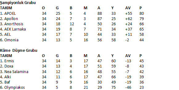 Güney Kıbrıs 1. Ligi’nde Şampiyonluk Grubu ve Küme Düşme Grubu’nun 34’üncü haftası geride kaldı. Şampiyonluk Grubu’nda şampiyonluk yarışını yakından ilgilendiren maçta APOEL konuk ettiği Apollon’u 2-1 yendi. APOEL ligin tamamlanmasına iki hafta kala rakibini zirveden indirerek bir puan üzerinde haftayı lider tamamladı.