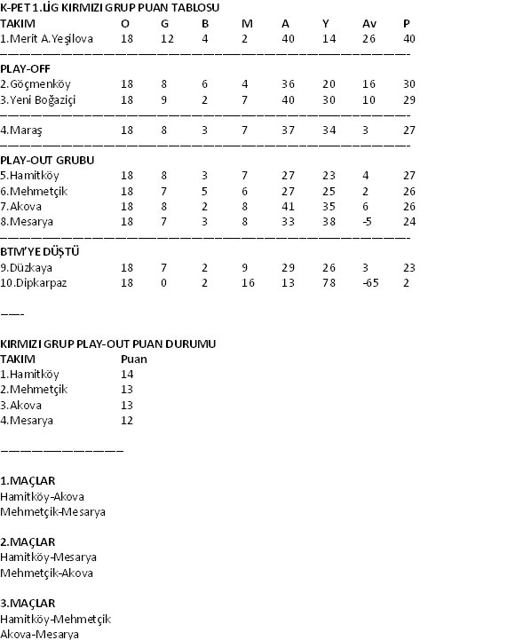 Birinci Lig’de bu sezon geçiş dönemi olarak 2 gruba ayrılaran Birinci Lig’in Kırmızı Grubu tamamlandı. Grupta Merit Alsancak Yeşilova şampiyonluğa ulaşırken, Düzkaya ve Dipkarpaz direkt olarak küme düştü. Play Off ve Play Out maçları önümüzdeki haftalarda oynanacak.