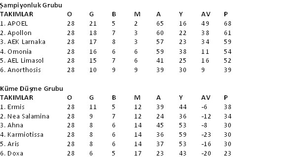Güney Kıbrıs 1. Ligi’nde Şampiyonluk ve Küme Düşme gruplarında ikinci karşılaşmalar oynandı. Şampiyonluk Grubu’nda lider APOEL evinde AEL Limasol’u 2-0’lık skorla mağlup etti. Üst sıraları yakından ilgilendiren maçta Apollon rakibi AEK Larnaka’yı 3-2 yenerek rakibini ikinci sıradan ederek bu basamağa yükseldi. Alınan bu sonuç APOEL’e yaradı ve Lefkoşa ekibi puan farkını 7’ye taşıdı. Grupta Omonia konuk ettiği Anorthosis’i 2-0 yenerek Avrupa kupalarına katılma şansını devam ettirdi.