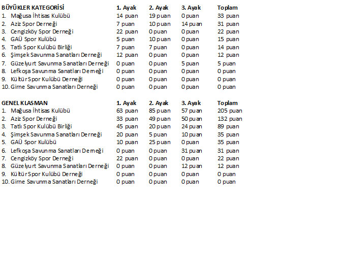 Çekişmeli geçen mücadelelerin ardından Genel Klasman’da 205 puana ulaşan Mağusa İhtisas Kulübü liderliğini sürdürürken, Aziz Spor Derneği 132 puan ile 2’nci, Tatlı Spor Kulübü ise 89 puan ile 3’üncü sırada yer aldı.