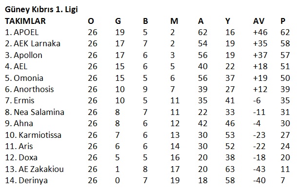 Güney Kıbrıs 1. Ligi’nde 26 haftalık normal sezon tamamlandı.