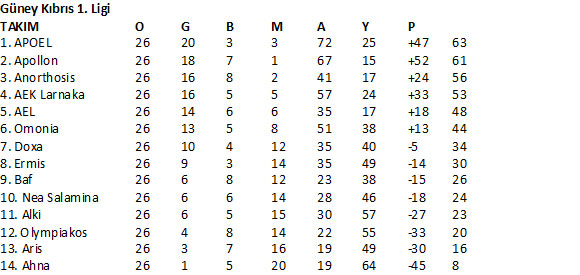 Güney Kıbrıs 1. Ligi’nde normal sezonun son haftası olan 26. hafta maçları hafta sonu oynandı. Deplasmanda Olympiakos’u 3-2’lik skorla mağlup eden APOEL normal sezonu lider tamamladı. Ligden haftalar önce düşmesi kesinleşen Ahna’nın yanı sıra önceki hafta veda eden Aris, bir alt lige düşen ekipler oldular. Apollon konuk olduğu Ahna’yı 4-1 yenerek normal sezonu ikinci sırada tamamladı. Anorthosis ise deplasmanda AEL’i tek golle yenerek 3’üncü olurken AEL 5’inci sırada yer aldı. AEK Larnaka deplasmanda Baf ile berabere kalarak normal sezonu 4’üncü sırada noktaladı. Omonia ise kendi evinde Doxa’ya 3-1 yenilerek 6’ncı sırada yer aldı. Ermis’in Aris’i 4-1 yendiği haftada Nea Salamina da deplasmanda Alki’yi 4-0 yendi.