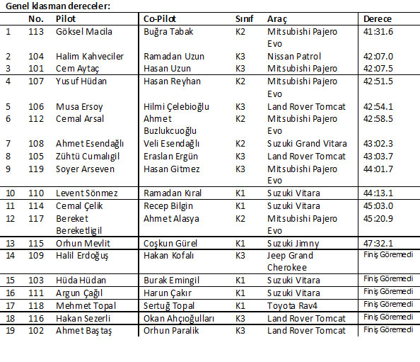Kuzey Kıbrıs Otomobil Kulübü’nün sportif direktörlüğünü üstlendiği yarışta 19 ekip start alırken, çeşitli sebeplerle 6 ekip finişe ulaşamadı. Araçların motor hacimlerine göre üç sınıfa ayrıldığı yarışta K2’nin lideri Göksel Macila-Buğra Tabak ikilisi olurken onları sırasıyla Yusuf Hüdan-Hasan Reyhan ve Cemal Arsal-Ahmet Buzlukcuoğlu ikilisi takip etti. K3’te Halim Kahveciler-Ramadan Uzun ikilisi ilk sırada, Cem Aytaç-Hasan Uzun ikilisi ikinci sırada ve Musa Ersoy-Hilmi Çelebioğlu ikilisi üçüncü sırada yer aldı. K1 sınıfını ise Levent Sönmez-Ramadan Kıral ikilisi kazandı. İkinci Cemal Çelik-Recep Bilgin ikilisi olurken, üçüncü Orhun Mevlit-Coşkun Gürel ikilisi oldu.