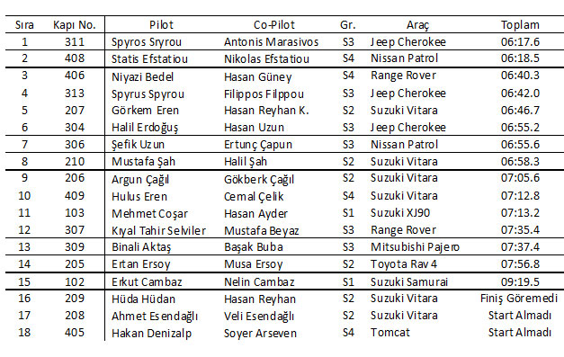 Günün en iyi derecesini elde eden ekip, yarışa güneyden katılan Spyros Sryou-Antonis Marasivos ikilisi oldu. Sınıf 3’te de ilk sırada yer alan ekibi sınıflarında Spyrus Spyrou-Filippos Filippou ikilisi takip etti. Sınıf 3 üçüncüsü ise Halil Erdoğuş-Hasan Uzun ikilisi oldu. Günün en iyi ikinci derecesini elde eden isim ise Statis Efstatiou-Nikolas Efstatou ikilisi oldu. Sınıf 4’te mücadele eden ikiliyi sınıflarında Niyazi Bedel-Hasan Güney ikilisi takip etti. Sınıf 4 üçüncüsü ise Hulus Eren-Cemal Çelik ikilisi oldu. Bu sonuçlarla yarışa güneyden katılan 3 ekip, ilk dört içerisinde yer almayı başardı. Sınıf 2’de Görkem Eren-Hasan Reyhan K. İkilisi birinci, Mustafa Şah-Halil Şah ikilisi ikinci ve Argun Çağıl-Gökberk Çağıl ikilisi üçüncü oldu. Sınıf 1’de ise Mehmet Coşar-Hasan Ayder ikilisi ilk sırada yer aldı. Baba kız yarışan Erkut Cambaz-Nelin Cambaz ikilisi ise ikinci oldu. Yarış sonunda dereceye girenlere kupaları düzenlenen törenle takdim edilirken, Anneler günü dolayısiyle yarışmacıların anneleri ve anne olan yarışmacıların eşlerine off road derneği tarafından küçük hediyeler verildi.