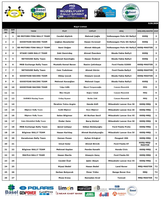 2025 Basel Holding Kuzey Kıbrıs Ralli ve Sprint Şampiyonası ikinci yarışı, Güzelyurt Otobüs Terminali karşısında bulunan MKB Change Exchange döviz bürosundan 13 Nisan pazar sabahı 10.30’da start alacak. 11.05’den itibaren Güzelyurt Baraj bölgesinde hazırlanan etapta ekipler biri deneme olmak üzere üçer kez start alacaklar. 11.00-14.20 arası devam edecek olan ralli, 14.30’de yine MKB Change Exchange döviz bürosu önünde yapılacak ödül töreni ile tamamlanacak.