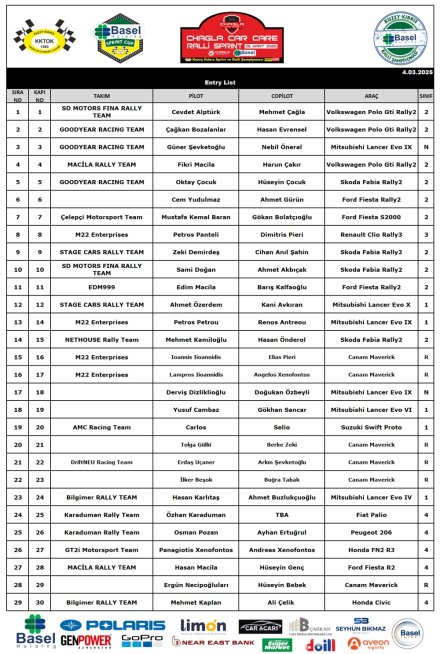 29 ekibin yarışacağı sezonun ilk yarışında 3 ekibimiz VW Polo GTI R5 ile, 4 ekibimiz Skoda Fabia R5 ile, 2 ekibimiz Ford Fiesta R5 ile 1 ekibimiz Ford Fiesta S2000 ile yarışa katılacak ve böylece toplam 10 ekibimiz Sınıf 2’de mücadele edecek ve rekor kırılacak. Renault Clio Rally 3 aracı ile Güney Kıbrıs Ralli Şampiyonu Petros Pantelli-Dimitris Pieri ikilisinin de katılacağı yarışa ayrıca Güney Kıbrıs Ralli Sprint Şampiyonu Petros Petrou-Renos Antreou ikilisi de katılacak. Şampiyon ekiplerimiz Cevdet Alptürk-Mehmet Çağla ikilisi, Çağkan Bozalanlar-Hasan Evrensel ikilisi, Güner Şevketoğlu-Nebil Öneral ikilisi, Fikri Macila-Harun Çakır ikilisinin yanı sıra birçok iddialı ekibin olduğu yarış izleyenlere oldukça keyifli dakikalar yaşatacak.