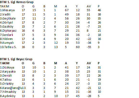Bölgesel Terfi Müsabakaları (BTM) 1. Ligi’nde son haftaya gelindi. Kırmızı Grup’ta şampiyon olan Mesarya Birinci Lig’e yükselirken, Vadili Play off oynamaya hak kazandı. Beyaz Grup’ta ise son hafta maçlarının ardından Düzkaya ve Karşıyaka takımlarından biri şampiyon, diğeri de Vadili’nin rakibi olacak.