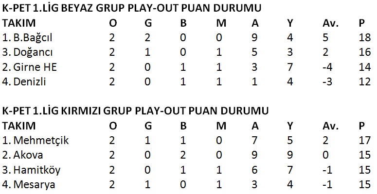 K-Pet Birinci Lig Beyaz ve Kırmızı Grup’ta Play-out ikinci maçları tamamlandı. Alınan sonuçlar neticesinde liglere veda edecek son takımlar haftasonu oynanacak. Üçüncü maçlarda belli olacak. K-Pet Birinci Lig Beyaz Grup’ta alınan sonuçlar neticesinde Bostancı Bağcıl ve Doğancı ligde kalmayı başardı. Kırmızı Grup’ta ise Mehmetçik lige tutunarak rahat bir nefes aldı.