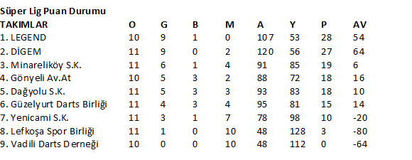 Dokuz takımın mücadele verdiği ligin 12’inci haftasında Dikmen Gençlik Merkezi (DİGEM), Güzelyurt Darts Birliği ve Minareliköy rakiplerini mağlup etti. Lider LEGEND’in bay geçtiği haftanın en önemli maçında Dağyolu ile Gönyeli Avcılık Atıcılık karşılaştı. Mücadele 8-8 eşitlikle sona erdi. Efes Pilsen Darts Süper Ligi’nin 12’inci hafta maçlarında alınan sonuçlar ve oluşan puan durumu şöyle:
