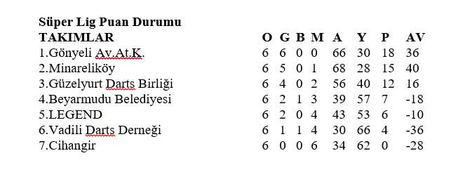 Efes Pilsen Darts Süper Ligi’nin ilk devresinin son maçlarında alınan sonuçlar ve oluşan puan durumu şöyle: