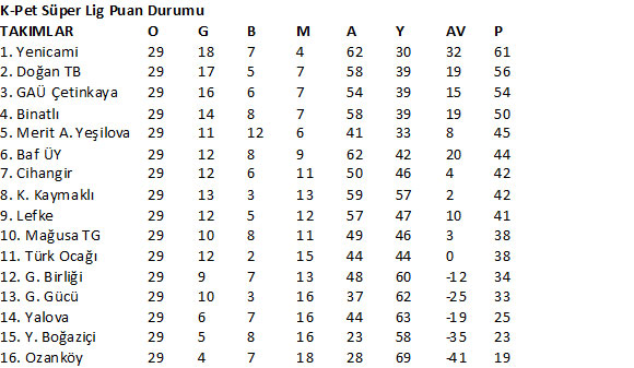K-Pet Süper Lig’de 30 haftalık normal sezon bugün ve yarın oynanacak olan karşılaşmalarla tamamlanacak. Ligde bugün GAÜ Çetinkaya ile Doğan Türk Birliği haftanın açılış maçında Atatürk Stadı’nda karşılaşacak. Yarın oynanacak 7 karşılaşma ile Süper Lig’de sezon sona erecek.