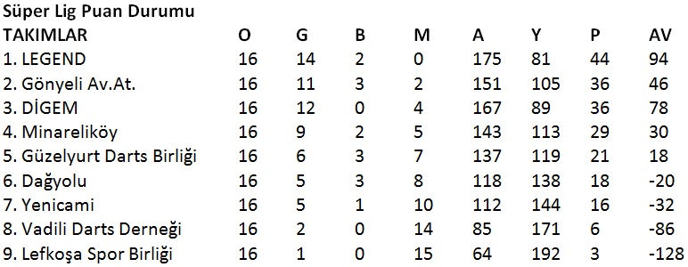 Kuzey Kıbrıs Darts Federasyonu tarafından düzenlenen Efes Pilsen Darts Süper Ligi oynanan 16’ncı hafta maçlarıyla tamamlandı.