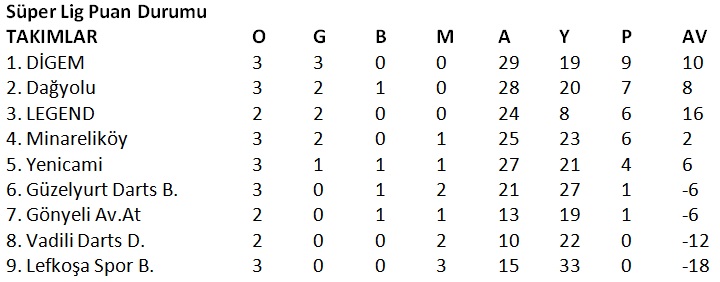 İki karşılaşmanın beraberlikle sonuçlandığı haftada Dikmen Gençlik Merkezi (DİGEM), konuk ettiği Vadili Darts Derneği’ni 10-6 mağlup etti ve haftayı lider kapattı. Efes Pilsen Darts Süper Ligi 3’üncü hafta maçlarında alınan sonuçları ve puan durumu şöyle: