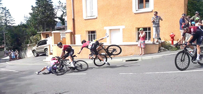 - Etap: Cumartesi günleri genelde Pazar günü öncesi rahat bir profile sahip olur Tour’da. Fakat 200 km’lik etabın profilinin kaçışa uygun olması, sürprizleri ve heyecanı da beraberinde getirdi. Haftanın kesinlikle en güzel etabı oldu diyebiliriz Macon – Saint Etienne arasındaki etap için. Kaçışların kralı Lotto Soudal sürücüsü Thomas De Gendt yarışın henüz başında yanına Niki Terpstra, Alessandro De Marchi ve Ben King’i de alarak atak yaptı ve farkı açmaya başladı. Peloton dinlenirken, Thomas De Gendt’in yapabileceklerinin de farkındaydı. Yarışın sonlarına yaklaşırken son 15 km’de INEOS takımı komple bir kaza yaşadı. EF Education First sürücüsü Michael Woods’un iniş virajında düşmesi sonrası arkasından gelen INEOS’un İtalyan sürücüsü Gianni Moscon yerde kaldı ve onun üzerine uçarak düşen 2018 Tour de France galibi Geraint Thomas, Moscon’un bisikletini ortadan ikiye ayırdı. Olaya çok hızlı reaksiyon gösteren takım Geraint Thomas’ı hemen bisikletine bindirmeyi başardı ve Galli sporcu yarışa dönebildi. Tüm kaos bu noktada başladı.