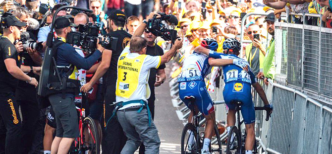 Sarı Mayoyu Ciccone’den geri alan etap ikincisi Julian Alaphilippe, Bastille Gününde sarı mayo ile etap geçecek olmanın mutluluğunu yaşarken, etap sonunda Pinot ile sarılmaları görülmeye değerdi.