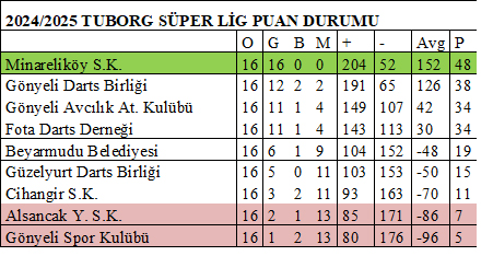 TUBORG Süper Lig’inde son hafta maçları Pazartesi akşamı oynanan çekişmeli maçların ardından sona erdi. Namağlup lider konumunda olan Minareliköy Spor Kulübü deplasmanda Gönyeli Avcılık Atıcılık Kulübü ile eşleşmesinde, 14 – 2 galip gelerek namağlup ünvanını koruyarak şampiyon oldu. Karşılaşmada kaptan Cemal Gingi en yüksek sayı olan 180’i bir kez atarken, Kadri Keleşzade ise 13 oktan legi bitirerek geceye damga vurdular.
