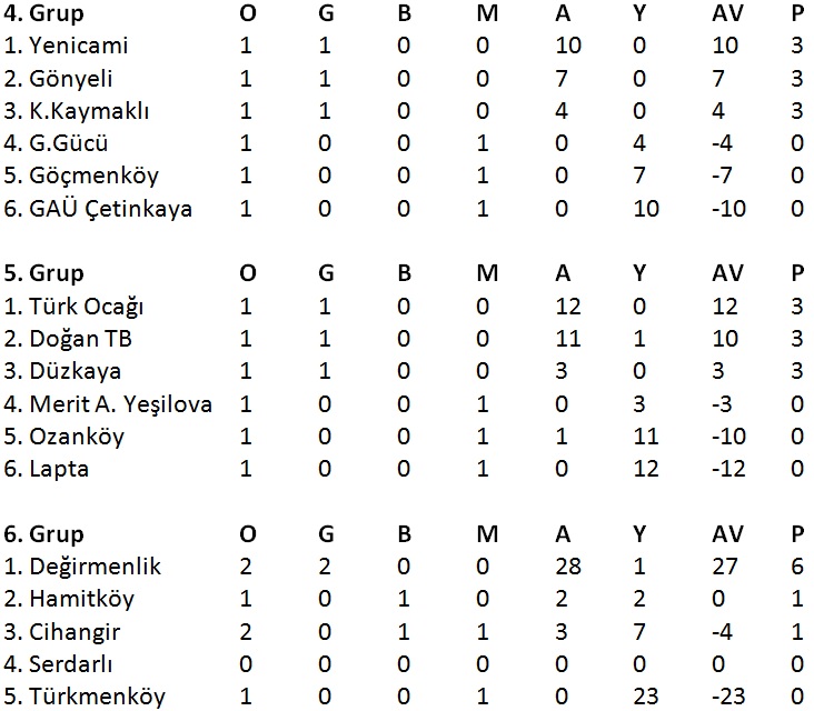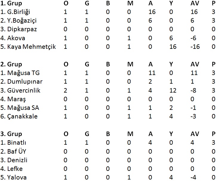 Altı grupta 33 takımın yer aldığı ligin ilk haftası çekişmeli karşılaşmalara sahne oldu. Oynanan karşılaşmalar sonunda alınan sonuçlara göre oluşan puan durumları şöyle: