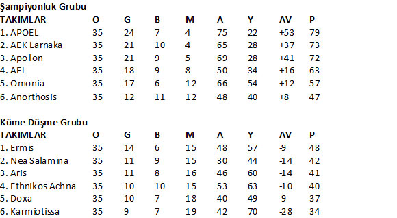 Güney Kıbrıs 1. Ligi’nde 35’inci hafta karşılaşmalarının ardından derbi mücadelesinde Omonia’yı 3-1 mağlup eden APOEL, üst üste 5’inci şampiyonluğunu elde etti. Son hafta öncesinde Omonia karşısında 1-0 geriye düşen APOEL, 3-1’lik skorla galip gelerek tarihindeki 26’ncı şampiyonluğa imza attı. Grubun diğer maçında Apollon ile Anorthosis, AEK Larnaka ile AEL 1-1 berabere kaldı.