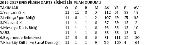 Kuzey Kıbrıs Darts Federasyonu (KKDF) tarafından organize edilen Efes Pilsen Darts Birinci Ligi’nde 11’nci hafta tamamlandı.