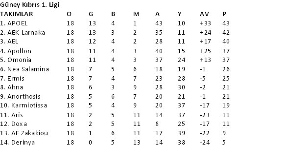 Güney Kıbrıs 1. Ligi’nde 18’inci hafta karşılaşmaları hafta sonu oynanırken önceki hafta liderliğe yükselen AEL, ilk basamağı APOEL’e devretti. Haftaya lider giren AEL, Limasol derbisinde konuk olduğu Apollon’a 2-0’lık skorla mağlup oldu. Apollon önceki hafta da AEK’i mağlup ederek zirveyi değiştiren takım olmutşu. Evinde Aris’i 5-0’lık farklı skorla mağlup eden APOEL ise liderliğe yükseldi. AEK deplasmanda Anorthosis’i tek golle yenerek ikinci basamakta haftayı tamamladı. Karmiotissa’yı deplasmanda 1-0 yenen Omonia haftayı 5’inci sırada tamamlarken, Nea Salamina kendi evinde AEZ’i 2-0 yenerek 6’ncı sırada yer aldı. Ahna’nın Ermis’i 3-1 mağlup ettiği haftada Doxa ile Derinya golsüz beraberlikle haftayı birer puanla tamamladı.